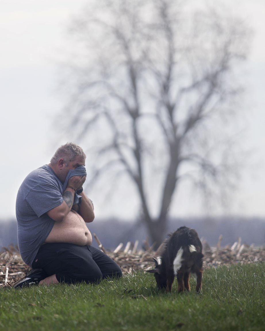 Terry Jesse kneels beside a surviving goat after a barn fire killed multiple goats in Arcanum.